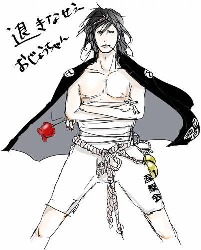 男の人のフィット感在る腰回りがちょっと毎度骨格苦手なので、今回はしめ縄で覆って隠してみました。腕細かったけど我ながら可愛く描けたと自画自賛しました。法被はうちの地区が黒なので黒にした。紋は左三巴。