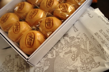 おみやげのまんじゅう。包み紙がかわいい、宿の住所がレトロに書かれている。